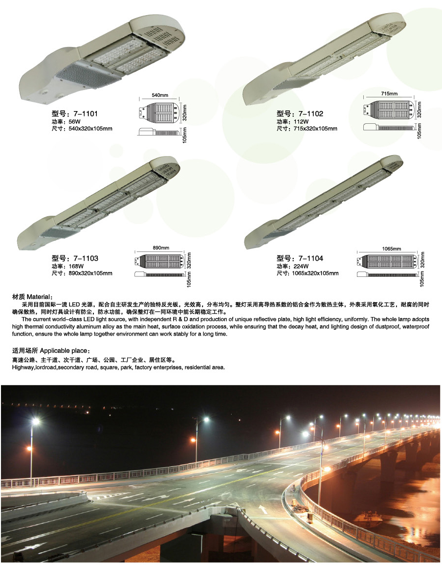 铝材的选用会影响灯体的寿命、外观。博耀照明一直致力于生产高品质led路灯,所有灯具采用一级成材铝散热材质,高导热系数快速散热,完美的解决散热问题,保证led寿命。外观优美、高档