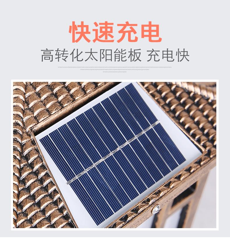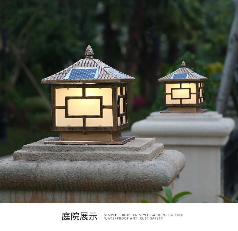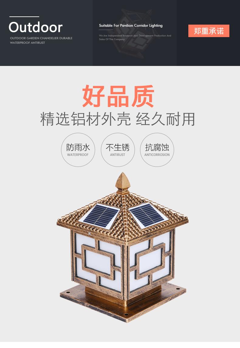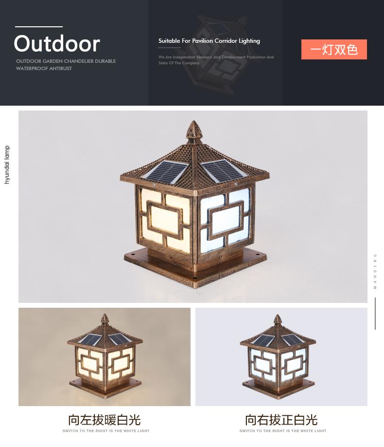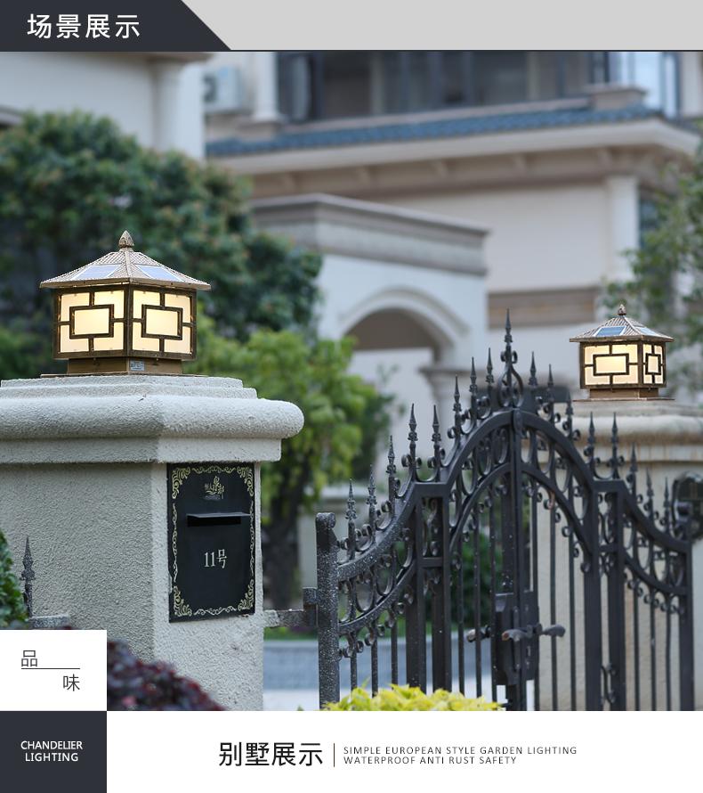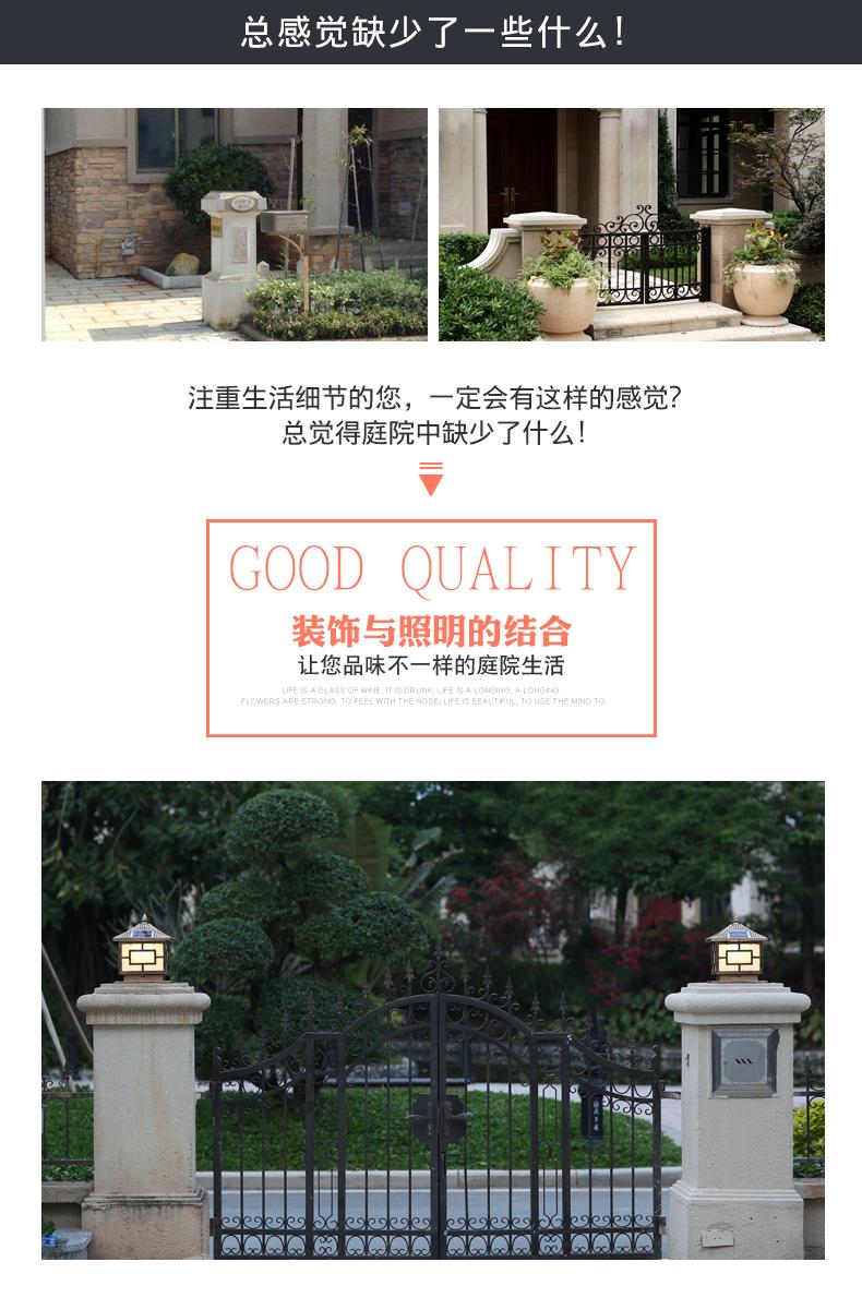 一般的围墙灯柱头灯大门柱子灯选用节能灯以及LED光源,现在用得多就是太阳能柱头灯,具有节能环保,寿命长。围墙灯柱头灯大门柱子灯材料是选用太空高级铝材,PC灯罩组成的。凯发网站·(中国区)官方网站这款是两用款,可以单靠太阳能发光,也可以市电,柱头灯要根据柱子的大小选择适合的标准,并且它的款式还要与运用的当地风格相结合,否则会显得柱头灯很唐突,给人以视觉疲倦,不能产生美的享用,不过现在的柱头灯一般都很百搭,凯发网站·(中国区)官方网站这款中字就非常适合别墅柱头灯上。