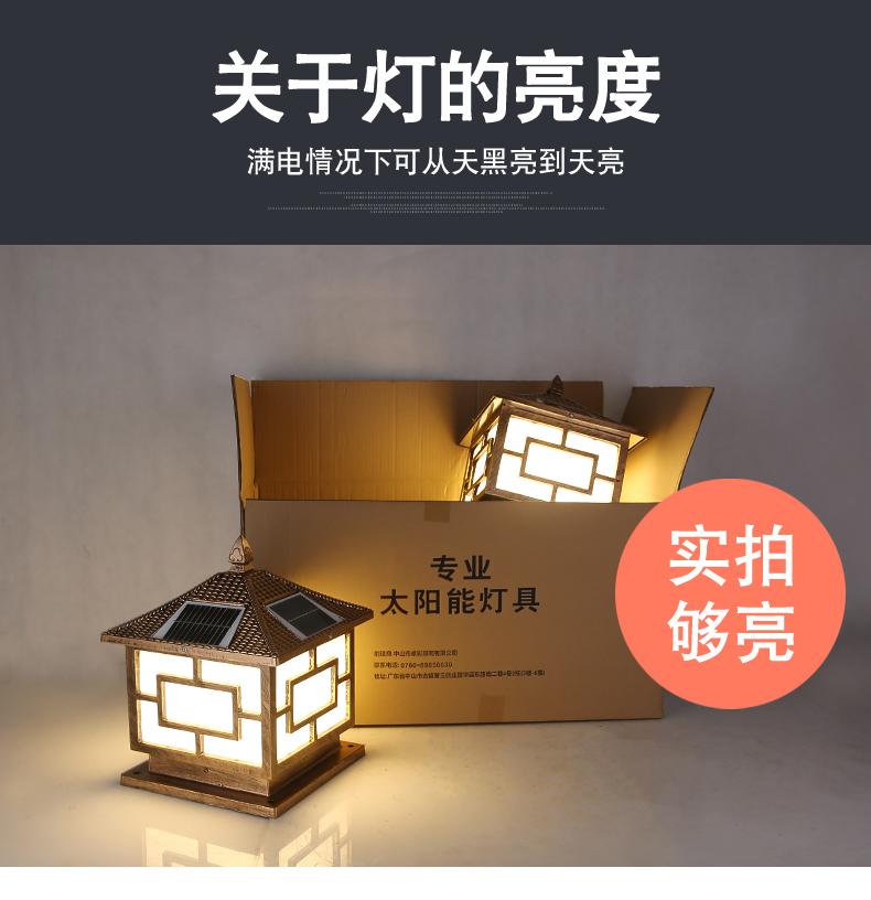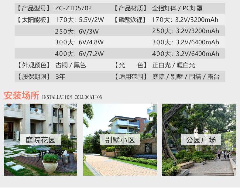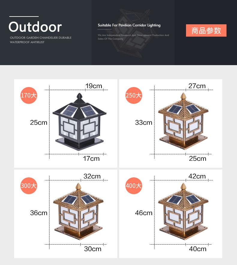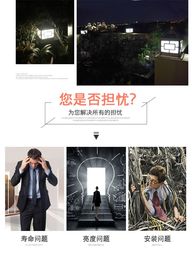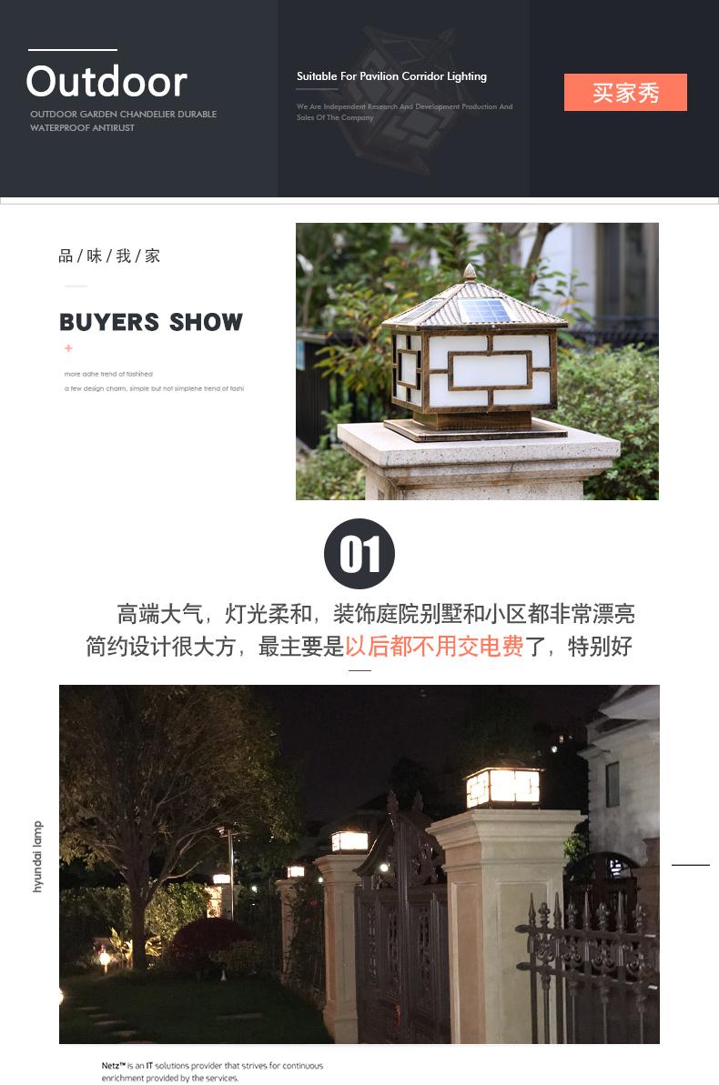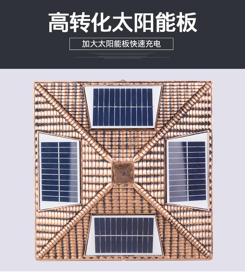 一般的围墙灯柱头灯大门柱子灯选用节能灯以及LED光源,现在用得多就是太阳能柱头灯,具有节能环保,寿命长。围墙灯柱头灯大门柱子灯材料是选用太空高级铝材,PC灯罩组成的。凯发网站·(中国区)官方网站这款是两用款,可以单靠太阳能发光,也可以市电,柱头灯要根据柱子的大小选择适合的标准,并且它的款式还要与运用的当地风格相结合,否则会显得柱头灯很唐突,给人以视觉疲倦,不能产生美的享用,不过现在的柱头灯一般都很百搭,凯发网站·(中国区)官方网站这款中字就非常适合别墅柱头灯上。